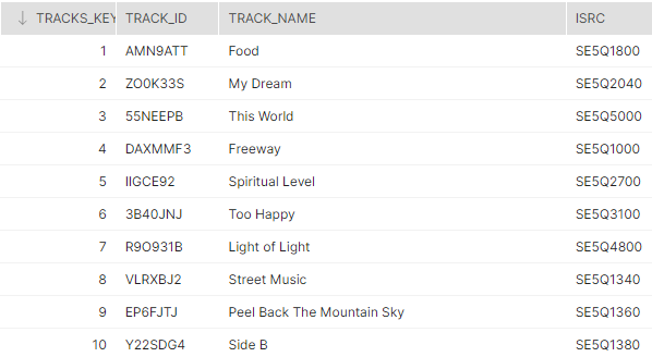 INNER JOIN EDW.DIMS.D_Tracks DT ON FS.Tracks_Key = DT.Tracks_Key